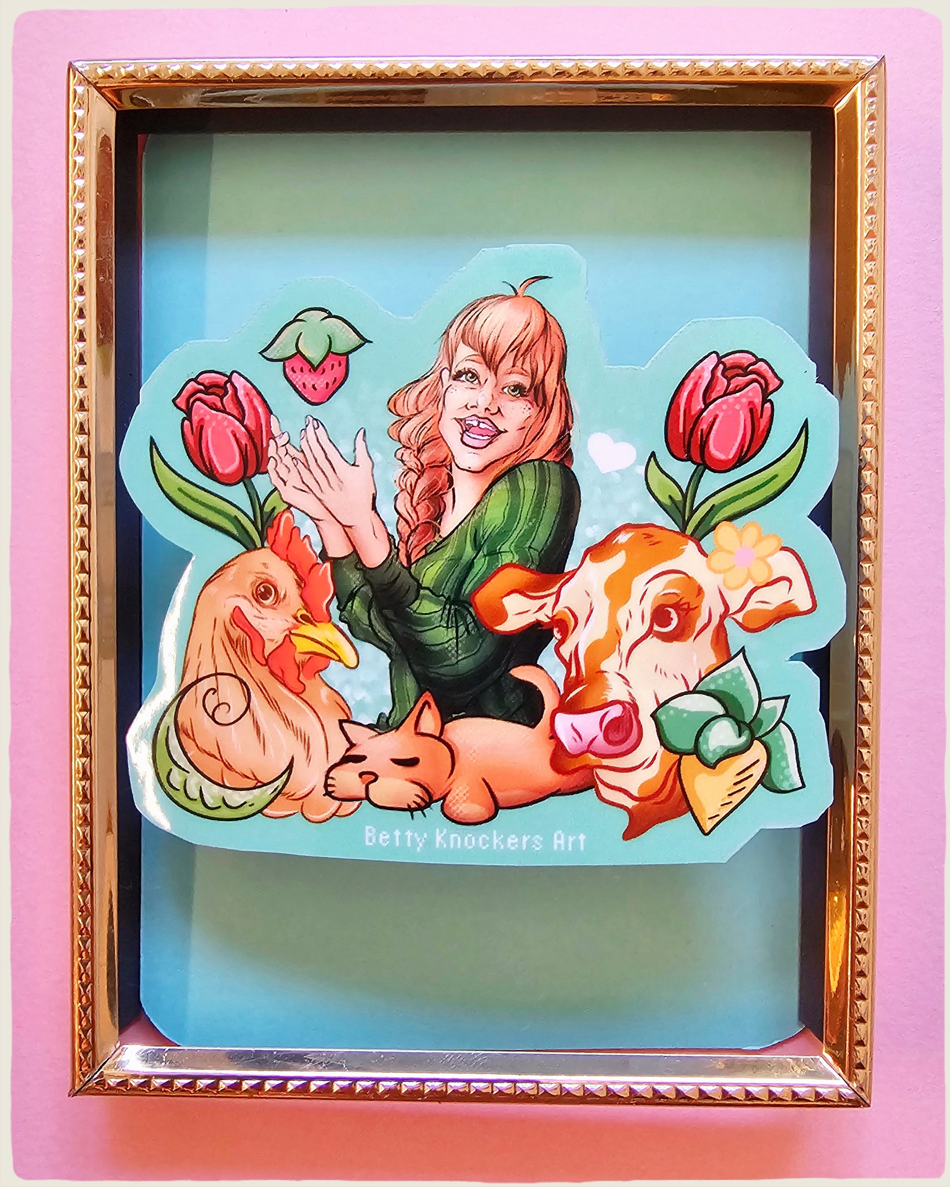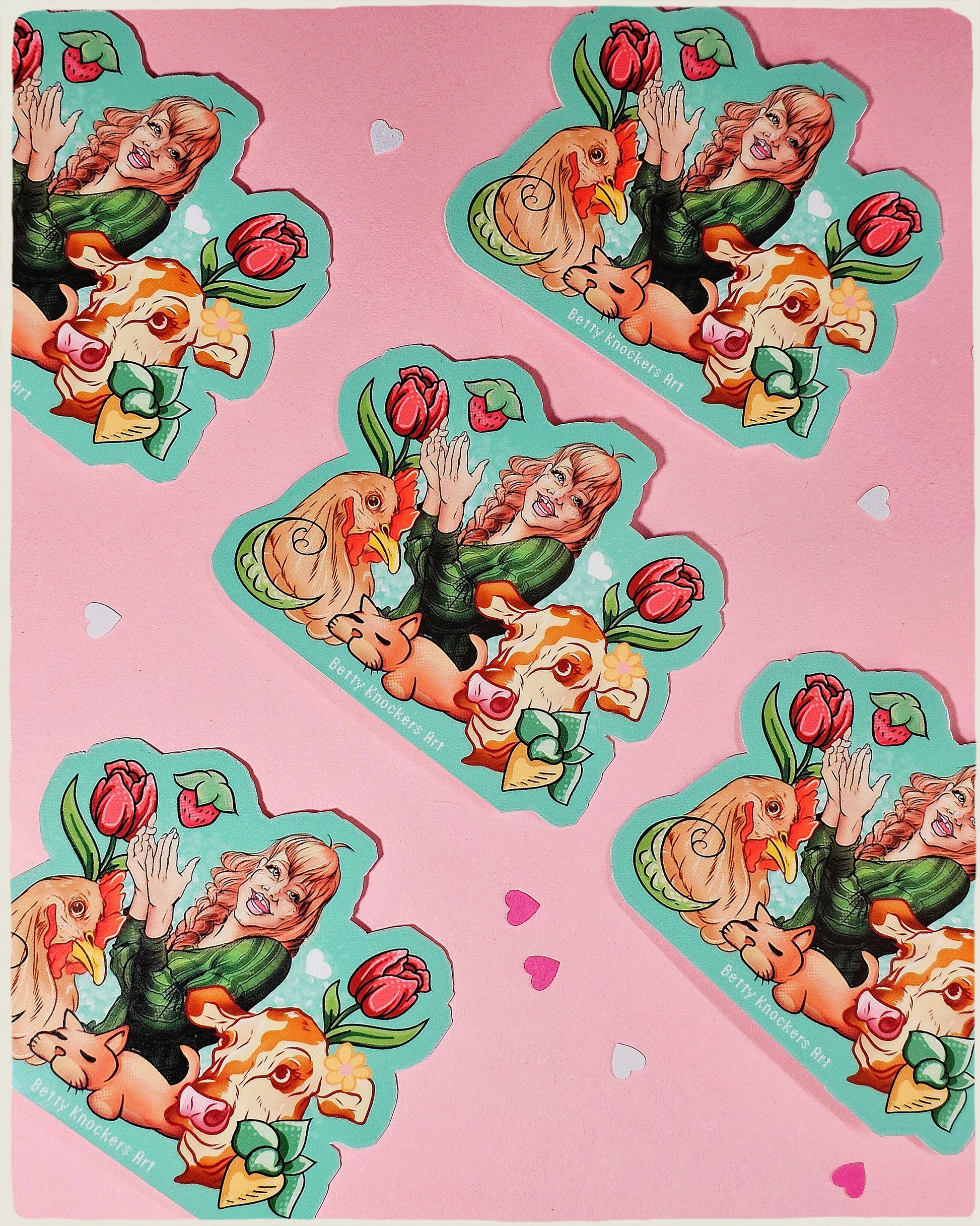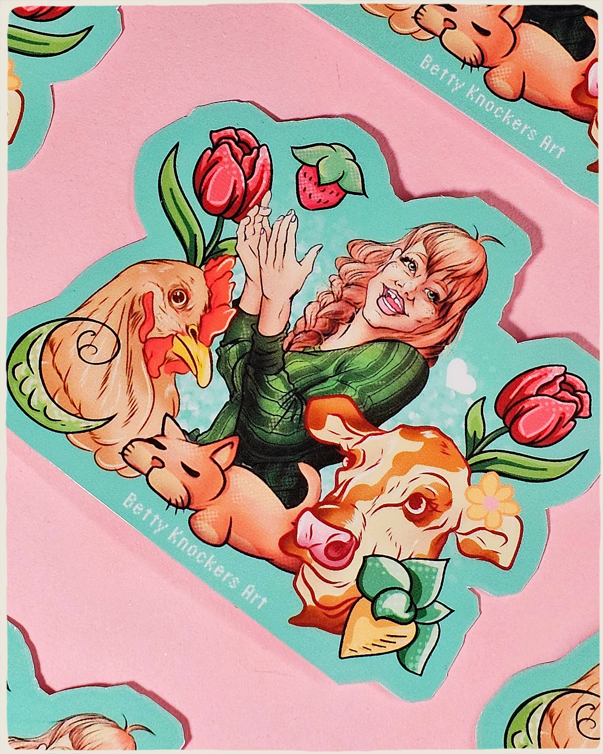 Come to the slower pace of Stardew Valley with the farmer enjoying the company of her animals and crops. Illustrated version of a pixelated game.